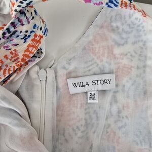 Gently used Willa Story Mia Dress in a size XS. Color is white with blue and orange geometric print.