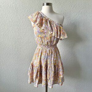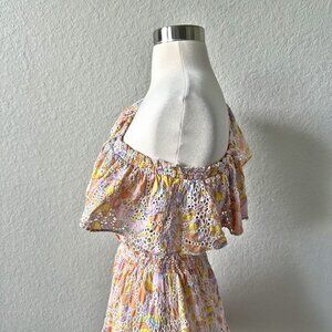 Willa Story One Shoulder Eyelet Pastel Ruffle Dress. This colorful, eyelet mini dress is perfect for vacation or a poolside soiree. *Please note model is AI depiction style of item, please see item photos.