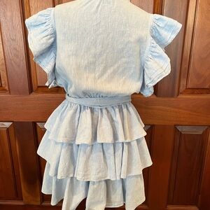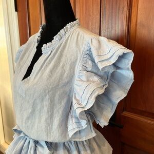 Willa Story linen blend Dress Blue V Neck Tiered Ruffle Flutter Sleeve Chambray - med