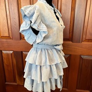 Willa Story linen blend Dress Blue VNeck Tiered Ruffle Flutter Sleeve Chambray M