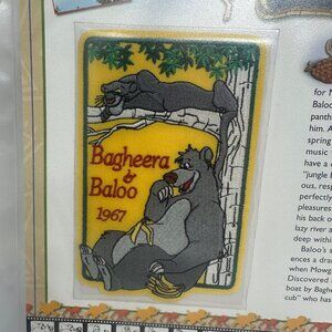 This collectible patch and card set showcases Baloo and Bagheera from Disney's 1967 "The Jungle Book." Ideal for Disney enthusiasts or memorabilia collectors.
