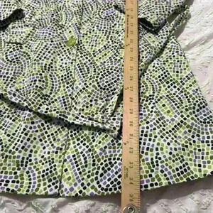 Step out in style in this Willi Smith mid-length button up lightweight jacket. It features beautiful lime green and purple detail. It is missing one button as shown in picture number seven. It is belted and super cute. See pictures for measurements and details.