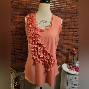 This stylish coral colored tank top by Willi Smith features a modern ruffled design that adds a touch of elegance. The sleeveless cut and soft material ensure a comfortable fit, making it a versatile addition to any wardrobe.
