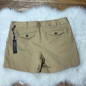 These tan cargo shorts by Willi Smith offer a tailored look with a flat front design and a mid-thigh length. Crafted from a structured cotton material, they are perfect for dressy casual occasions.