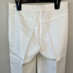 Classic pair of white linen Capri pants measuring 16 inches at the waist laying flat, 19 inches at the inseam, and with a 11 inch wide leg.