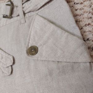 Lightweight linen blend pants, neutral with a touch of sparkle thanks to the metallic thread woven in. Includes a fun double belt accent.