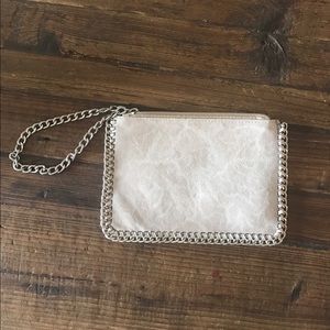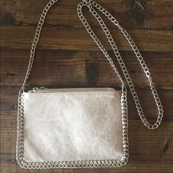 This distressed metallic beige leather bag acts as a purse or a clutch. I love how it has a long silver chain strap, which can also be removed easily. If you want a simple hand held clutch, it comes with a shorter version of the long silver chain strap to grasp it easier. The perfect going out bag! Never been used