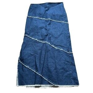 The William B VTG Long Denim Skirt with Slit and Fringe Detail in size 12 is a stylish and versatile piece perfect for casual occasions. Made from denim fabric with a solid blue color, this vintage skirt features a zip closure and a slit detail for added flair. The long skirt length and straight & pencil style make it a trendy choice for those embracing the Y2K, hippie, grunge, bohemian, and 90s themes. Machine washable for easy care.