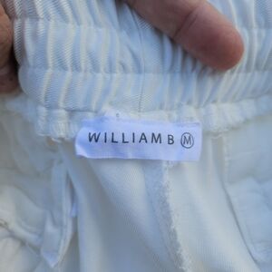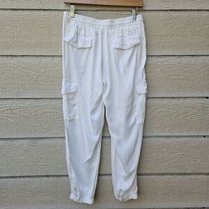 White cargo joggers. Elastic waist and ankles, with added drawstring at waist. 100% tencel. The pants are a warm white - compare with the brand tag which is a super bright white. 100% tencel.