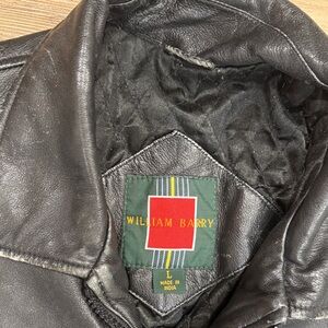Classic black leather jacket by William Barry. Features durable material and sleek design. Ideal for versatile wear.