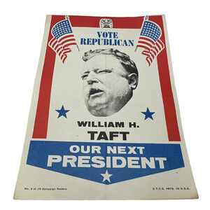 This is a vintage 1972 Topps campaign poster featuring William H. Taft, the 10th President of the United States. The poster is a part of the "Our Next President" series and is numbered 2 out of 15. It measures 5x7 inches and is a great addition to any political or historical memorabilia collection. The poster showcases Taft's name, face, and political party, making it a perfect item for any voter or history enthusiast. Add this unique piece to your collection today!