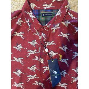 Elevate your style with this classic William Murray polo shirt in size L, featuring a brick red collar and a playful camouflage pattern with Bill the cat. The short sleeve shirt is made of a comfortable and stretchy microfiber fabric, consisting of Polyester and Spandex, perfect for your next golf game or a casual day out. This polo shirt is from the William Murray Golf product line and is perfect for men who appreciate a perfect fit shirt with a collared neckline. The shirt is in excellent condition and will make for a great addition to any wardrobe.