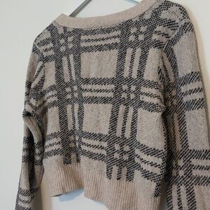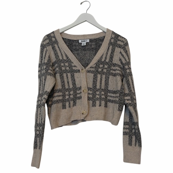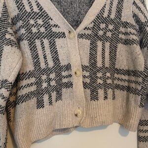 Soft, warm cropped cardigan sweater. Light pink/beige fabric with black grid pattern. V-neck with three buttons. Ribbed trim.