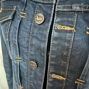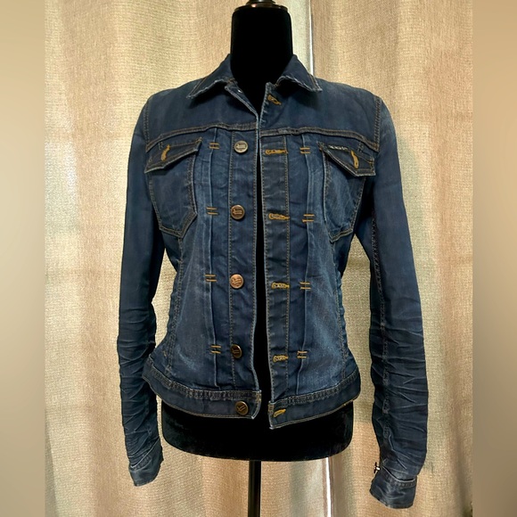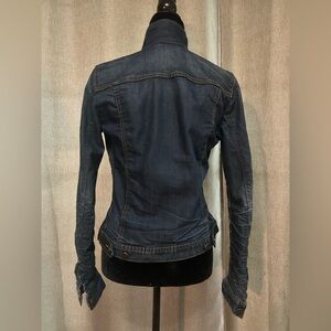 This stylish denim jacket has details that set it apart from your average jean jacket. Detailing on the front. Scrunched arms for pushing up and stretchy fabric. Pockets are still sewn closed like new.