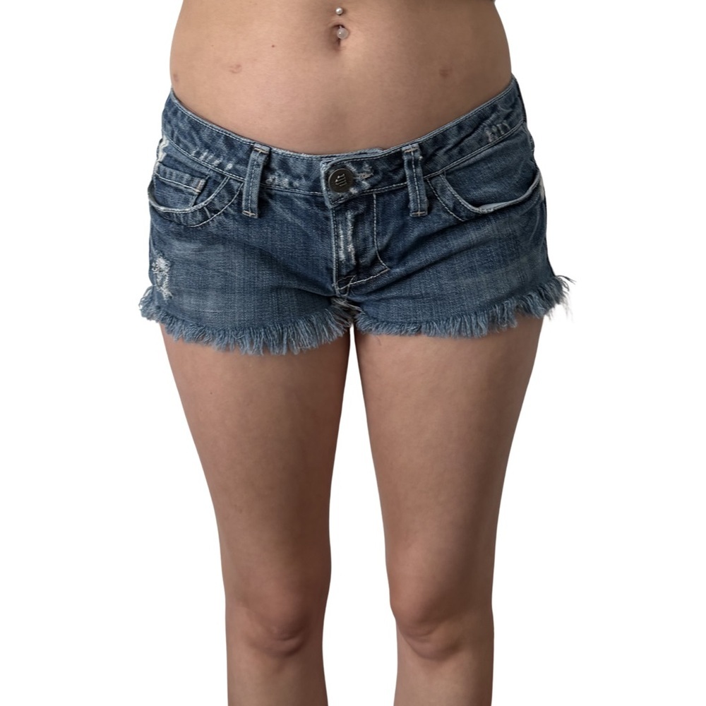 Trendy distressed jean shorts. Perfect for casual wear. Features frayed hem. Very Y2K! Loved but taken care of, sold as is.