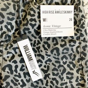 NWT (new with tags) William Rast High Rise Skinny Ankle Jeans. Iconic Vintage inspired denim. Slight stretch (98% cotton, 2% elastic). Night cheetah style, black and gray jeans. Iconic vintage. Five pocket styling. Button and zipper closure. Size 26.