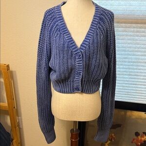 Stylish blue cardigan with a textured design. Button-up front and ribbed details. Perfect for layering.