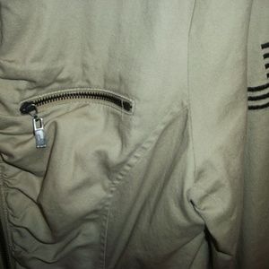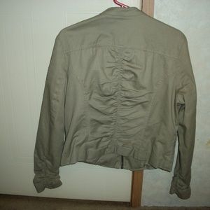 100% cotton with polyester-lined sleeves. Measures 20" armpit to armpit and 21" length. Tag says XL but it fits like a Medium. Lots of ruched detail on body and sleeves which are not adjustable.