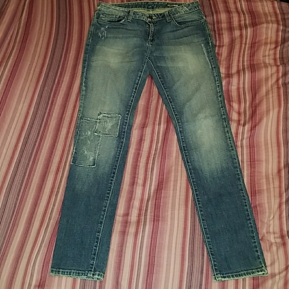 Distressed Skinny Jean with Patchwork on Right Knee. Could use a denim dye dip.