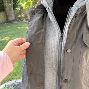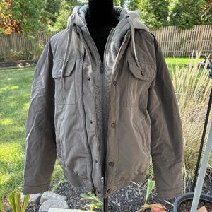 Gray zip up and button bomber jacket...faux gray sweat jacket with permanent sweat jacket hood...Tailored and casual...great for fall/winter...worn a handful of times before my son grew out of it...excellent condition!