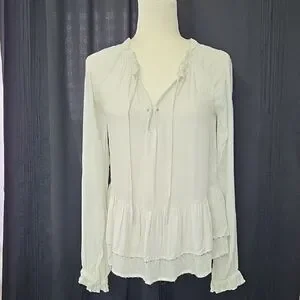 Chic blouse with ruffle details. Long sleeves and tie neckline. Perfect for versatile styling.