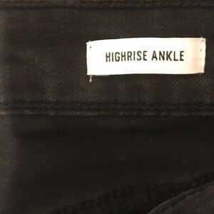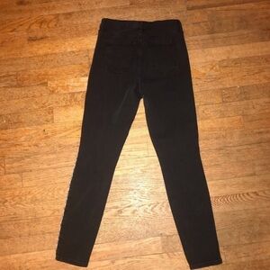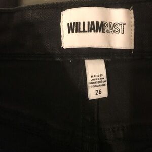 Pre-loved good condition William Rast (Justin Timberlake’s brand) black high rise, button and zipper fly ankle jeans with white/grey/black snakeskin along outer hem from waist to pants hem size 26