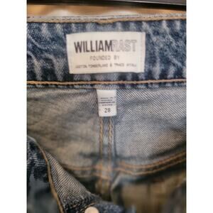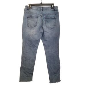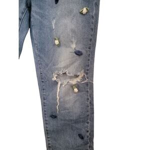 William Rast cropped, distressed jeans with flower buds sewn on, size 28 / 6. These button fly jeans are cropped up high in the front of the leg than the back of the leg. The flower buds are navy and white with green petals. The inseam measures 27" long, the waist is 16" across and the hips 20" across.