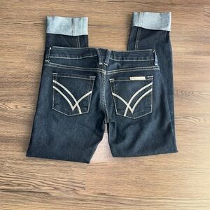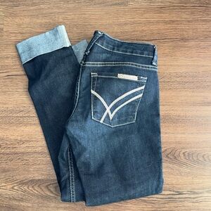 Like new bottom of jeans has no hem was worn as a folded larger cuff style