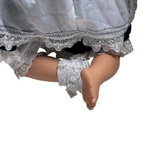 Cute face. Curly red hair with plastic appendices and cloth stuffed body. Approx 24 inches long. 2002. Nice condition though she is missing one shoe, has some light stains on bloomers and pull on apron.