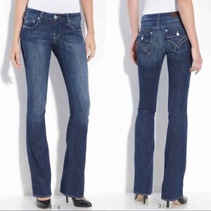 Features: Boot cut, Flap pockets in back, 5pocket style, Low rise, Stretch denim, Dark blue wash, Rhinestone pocket detailing, Gems on back side,