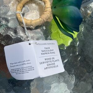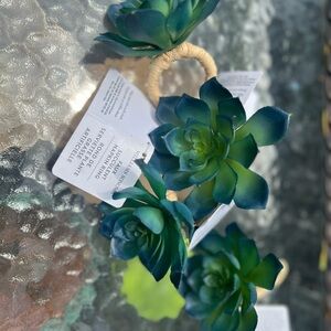 These Williams Sonoma faux floral accents feature a lush green hue, perfect for adding a touch of nature to your decor. Crafted with a realistic design, they bring a fresh and vibrant look to any space. Ideal for creating stunning arrangements or as standalone decorative pieces. Set of 4 Napkins Ring NWT from Williams Sonoma. Thank you.