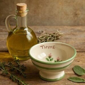 Add a touch of rustic elegance to your table with this delightful Thyme bowl part of the Williams Sonoma Herbs Flora dipping bowl set.