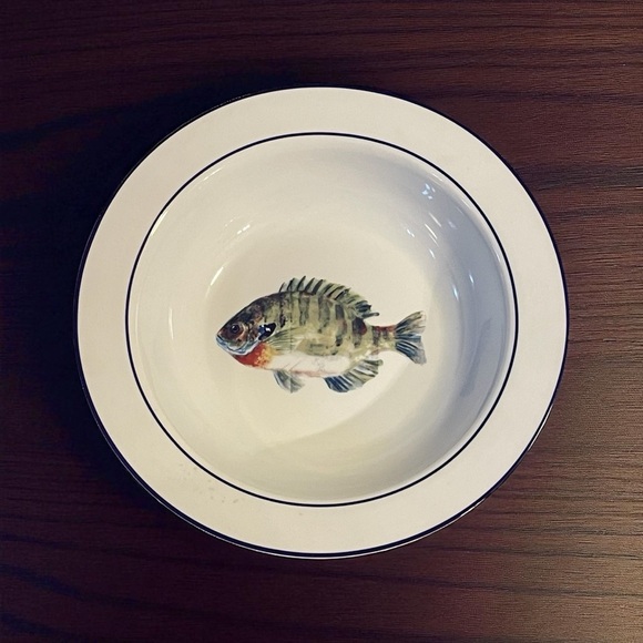 Add a touch of rustic charm to your dining table with this Williams Sonoma La Mer Fish style ceramic bowl. Featuring a beautifully detailed fish illustration in the center and accented with a thin navy trim around the rim, this piece is perfect for lake house, cabin, or nautical-themed décor.