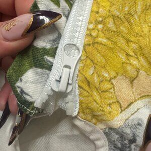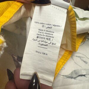This is a new with original tags item that has been discontinued online. The Williams Sonoma Limone (Meyer Lemon) table cloth is a beautiful display off bright yellow lemons and green leaves accented with a yellow and gray border. It is made with 100% cotton that has an oil cloth feel to it. It is made for an table with umbrella, as it has a zipper and central hold for the umbrella to go through. Made in Italy. Measures 70x108. I have opened the package for tag photos as well as to test the zipper.