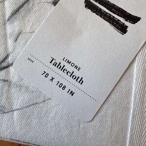 This is a new with original tags item. The Williams Sonoma Limone table cloth is a beautiful display off bright yellow lemons and green leaves accent with blue-and-white trim. It is made with 100% cotton-twill in Italy and finished with mitered corners. Measures 70x108.