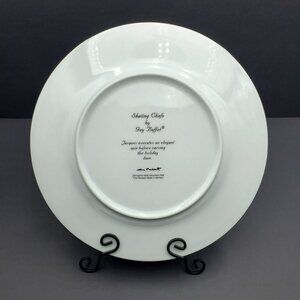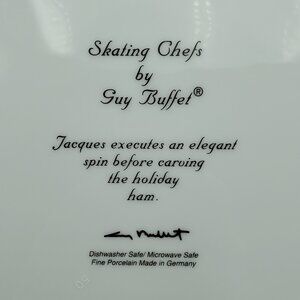 Williams Sonoma Skating Chefs by Guy Buffet Dinner Plate - Jacques. Excellent pre-owned condition. Large 10-7/8" porcelain plate made in Germany. As of this writing, I have the following dinner plates from this set. All feature a chef on ice skates with a winter scarf carrying various holiday meal items - turkey, sweets, ham, soup. Please check with me before bundling due to weight.
