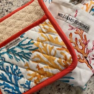 NWT Williams-Sonoma apron and oven mitt in ocean coral motif. Purchased in late 20-teens, never used. May have minor wear from age and storage, but otherwise in excellent, unused condition. Original price tag still adhered, as pictured. Great quality, 100% cotton, made in India. Perfect for beach house, beach lover, or Williams-Sonoma collector!