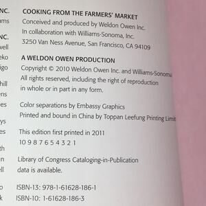Williams-Sonoma Cooking from the Farmers' Market Cookbook. Hard Cover with dust jacket, 271 pages, 2010. Preowned excellent condition with no writing, highlighting or tears. From a non-smoking home. Beautiful book with gorgeous photos!