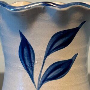 Williamsburg Pottery Salt Glaze Pottery Ruffled Rim Vase w/ Cobalt Blue Flower
