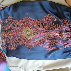 Willow Bay Blouse, puffy sleeve, elastic waistband, navy/pink, sz M
