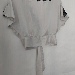 Willow Blossom silver grey silk crop tie waist top. Silk. Split sleeve detail at lace accents. Size M.