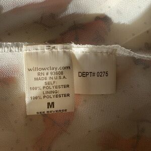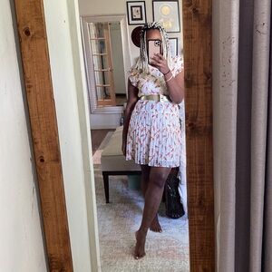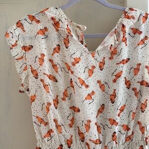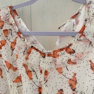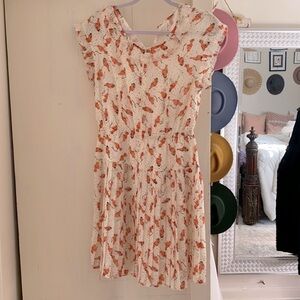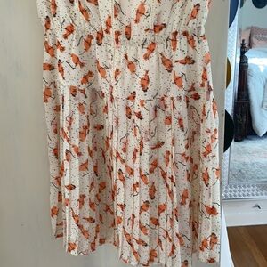 Elastic waistband pleated Orange and cream dress with birds , one button at back worn once size M midi dress