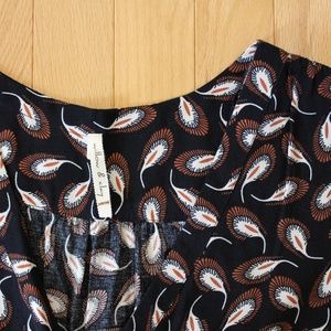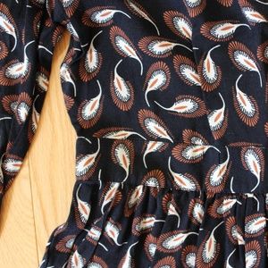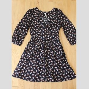Willow & Clay. Black dress with stylized white and brown feather pattern. No stretch. V-Neck. Invisible side-zip. Sleeves are loose in the arm, hit just below the elbow cinch back in. Cinches at the waist. Wrap dress look when on.