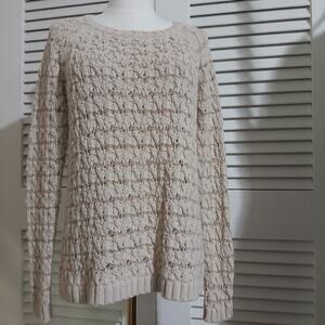 In great condition, this heavyweight sweater can be dressed up with cream knit pants for a sophisticated look or down with jeans for a more casual vibe. Perfect for adding a touch of elegance to any outfit!