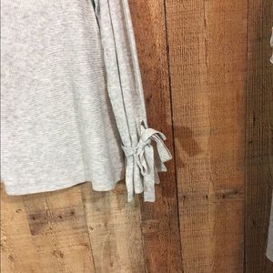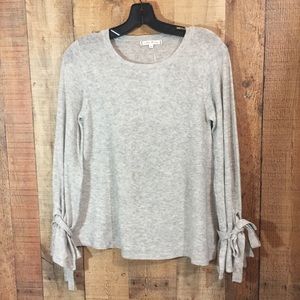 Heather gray sweater. Bell sleeves with tie detail. Size small, approx. 16" across x 24" long. Acrylic blend. NWT