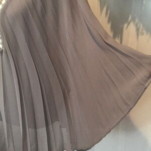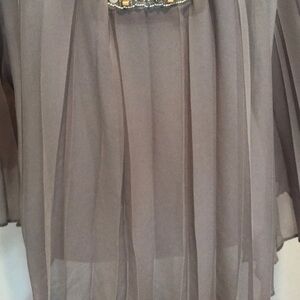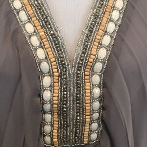 This is a gray, beaded neckline, polyester top that can be worn with a cami under it to look amazing with jeans, a skirt, whatever you think! If you aren't a pleat person you can iron this and it'll just be a flowy, beautiful top. Measures approximately 26.5-28 from top to bottom, depending on where you measure. The smaller seed beads are sewn only every couple of centimeters, so they don't lie perfectly flat but if you want them to, you can always tack them down more or even glue them.