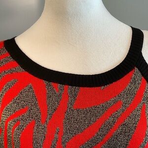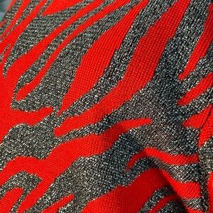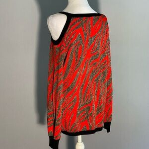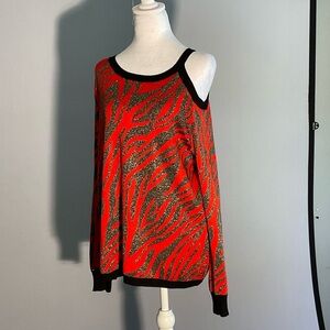 This Willow Drive Red, Black, Silver, Lg Holiday Sweater with an Asymmetrical One Cold Shoulder Neckline is perfect for the Holiday Season. Its red and silver Zebra Fire Woven design shimmers in the light as you move. Wear it to any special occasion, dinner date, cruise wear, wedding, plays, art opening, rave, you will shine! This Relaxed Fit Large Ladies Sweater is in like new condition and is priced to sell.