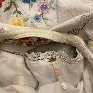 White Free People mini dress with floral embroidery; worn several times; small tan stain on the back of the neck (pictured)