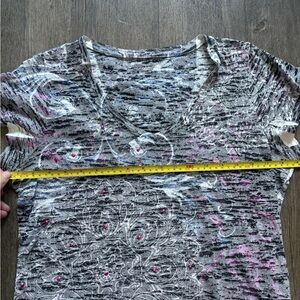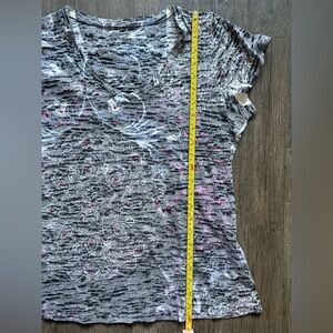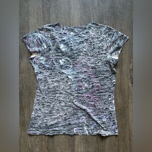 Chic short sleeve tee with a gray and pink abstract design. Ideal for everyday wear.