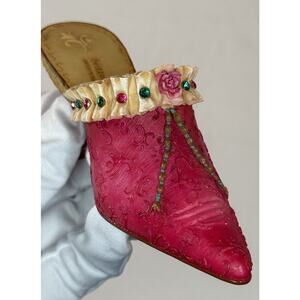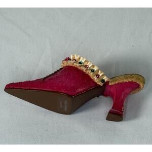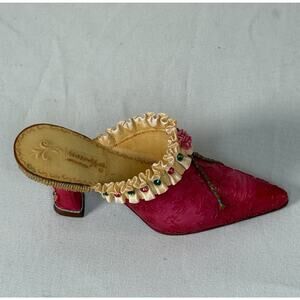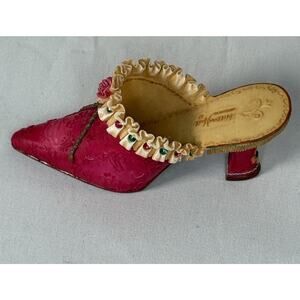 The Willow Hall Miniature Vintage Mule Figurine, Pretty Maiden Circa 1810, is a beautifully hand-painted small figurine depicting a charming scene from the Age of Elegance. This multicolor floral pattern shoe figurine stands at 1.5 inches tall and comes in a boxed packaging, making it a perfect addition to any collector's display. The intricate details and enchanting design of this figurine are sure to delight and inspire fans of decorative collectibles.